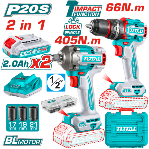 Ver todos los detallesProducto: Combo inalámbrico 20V – Industrial TOTALSKU: UTOSLI250591 Herramientas incluidas:Taladro percutor 1/2" – 66 NmAtornillador para drywall 1...