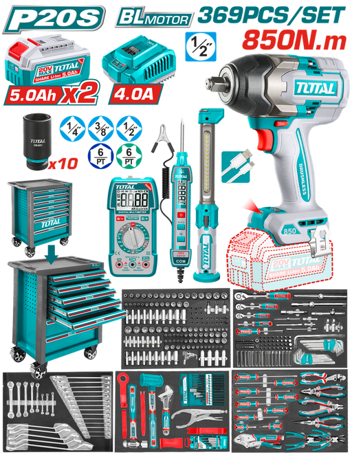 Juego de caja de herramientas de 369 piezas369 Pcs Tool Chest Set Llave de impacto inalámbrica de 850 NM (TIWLI20851):- Motor sin escobillas- Volta...