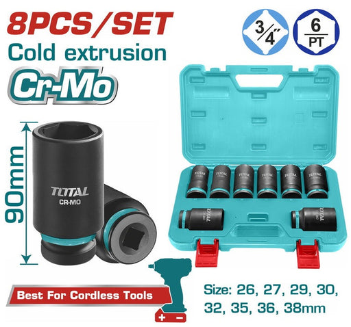 Juego de Dados Largos de Impacto de 3/4" DR. de 8 Piezas. Largo: 90 mm. CrMo. Tratamiento Termico. Tamaños: 26.27.29.30.32.35.36.38.mm.