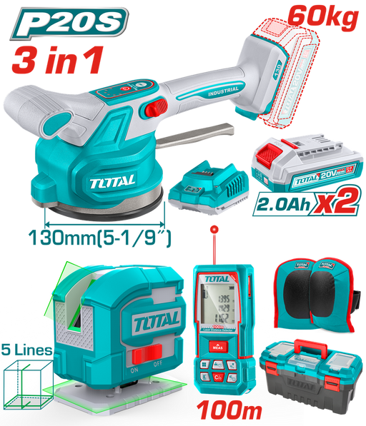 Ver todos los detallesVIBRADOR DE BALDOSA INALAMBRICA 20V CON VENTOSA CAP 60KG INCLUYE 1 PAR DE RODILLERAS, ESPATULA, SEPARADORES DE BALDOSA (1.5- 2.0-2.5), 1 BATERIA 2.0AH , CARGADOR Y CAJA HERRAMIENTA INDUSTRIAL TOTAL (UTTVLI20018)