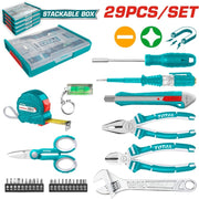 Contiene: 1 Alicate de Combinacion de 7''. 1 Alicate Diagonal de Corte de 6''. 1 Llave ajustable de 8''. 1 Tester tipo lapiz (Voltage 100-500 VAC). 1 Cinta Metrica de Acero de 3 m. 1 Exacto. 1 Tijera de 5.5''. 1 Mango Magnetico para Puntas de Destornillador. 20 Puntas para Destornillador: SL3, SL4, SL5, SL6, PH0, PH1, PH2, PH3, PZ0, PZ1, PZ2, PZ3, T10, T15, T20, T30, H3, H4, H5, H6 25 MM. 1 Nivel de Burbuja.