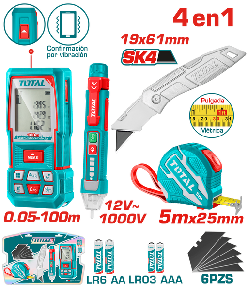 Kit profesional SUPER TOTAL, ideal para electricistas y técnicos. Incluye probador de corriente 12V–1000V, medidor láser de 100 m, metro de 5 m y b...