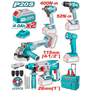 COMBO INALAMBRICO 20V TALADRO 3/8" 52NM + PISTOLA DE IMPACTO 1/2" 400NM + TALADRO ROTOMARTILLO 2,5 JULES + PULIDORA 4 1/2" + LINTERNA INCLUYE 2 BATERIA 20V(4.0AH) INCLUYE 25 DISCOS DE CORTE Y ACCESORIOS INDUSTRIAL SUPER TOTAL (UTCKLI2058)